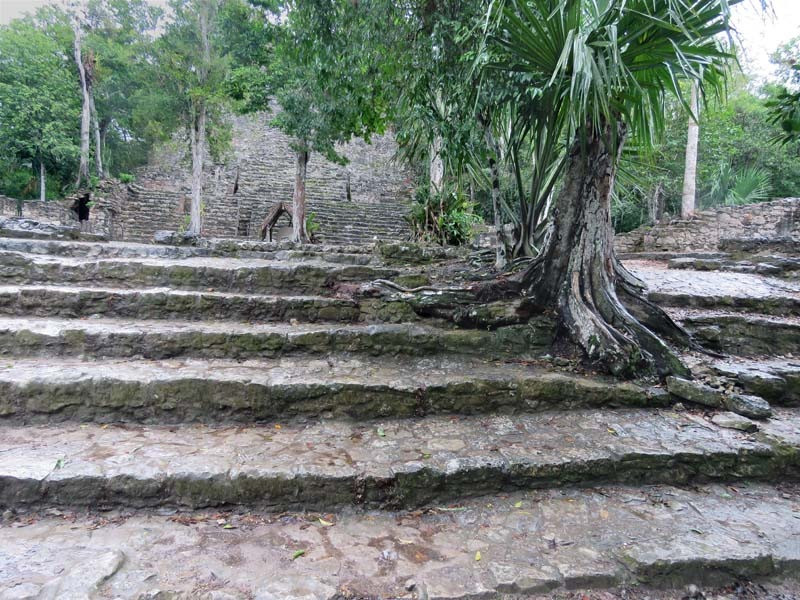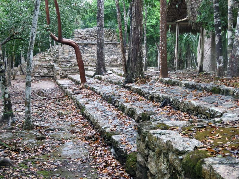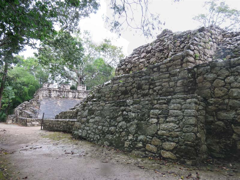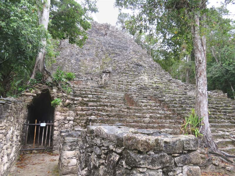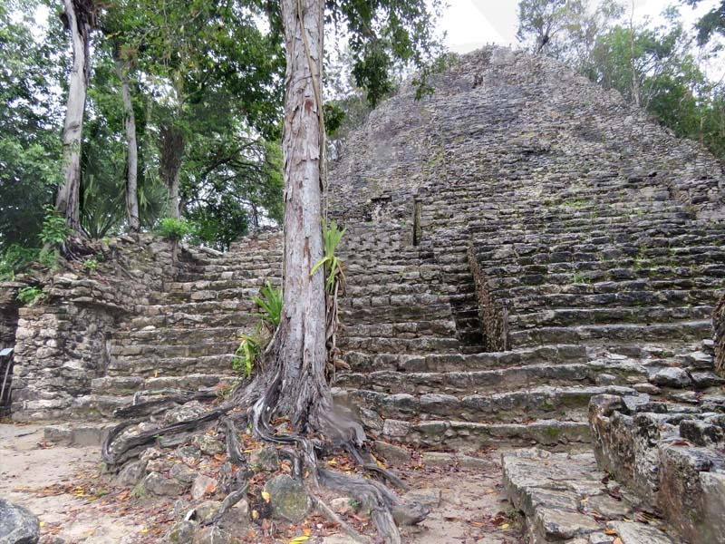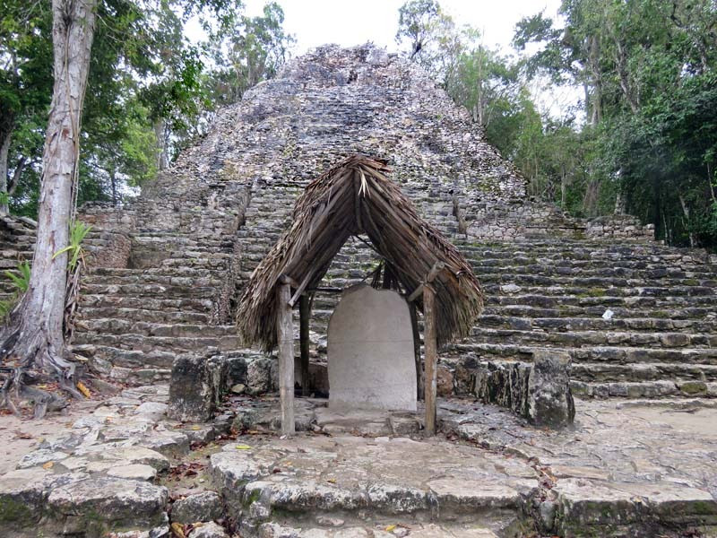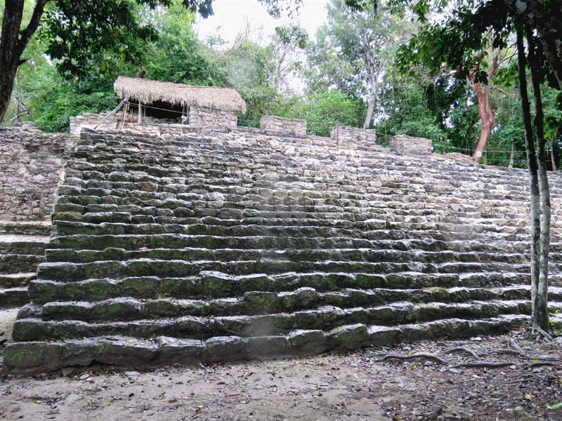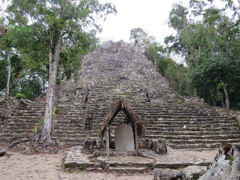 Coba is an ancient Maya city on the Yucatán Peninsula, located in the Mexican state of Quintana Roo. As part of the largest network of stone causeways of the ancient Maya world, Coba contains many engraved and sculpted stelae that document ceremonial life and important events of the Late Classic Period (AD 600–900) of Mesoamerican civilization. The ruins of Coba lie 29 miles northwest of Tulum, also in the State of Quintana Roo. Located around two lagoons, Lake Coba and Lake Macanxoc, a series of elevated stone and plaster roads radiate from the central site to various smaller sites in the area. These roads are known by the Maya as "sacbe" or white road. Coba contains a group of large temple pyramids known as the Nohoch Mul, the tallest, Ixmoja, is 138 ft. in height.