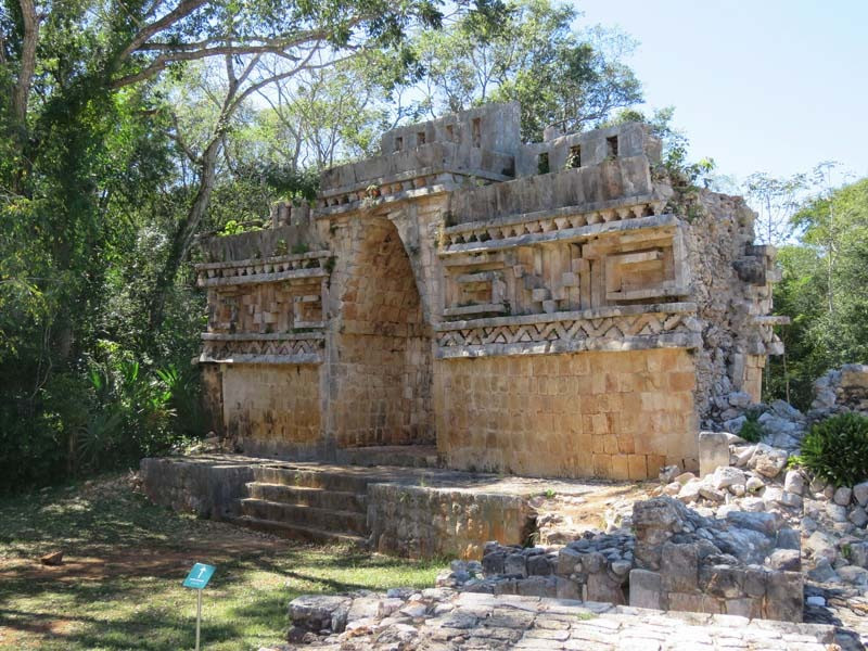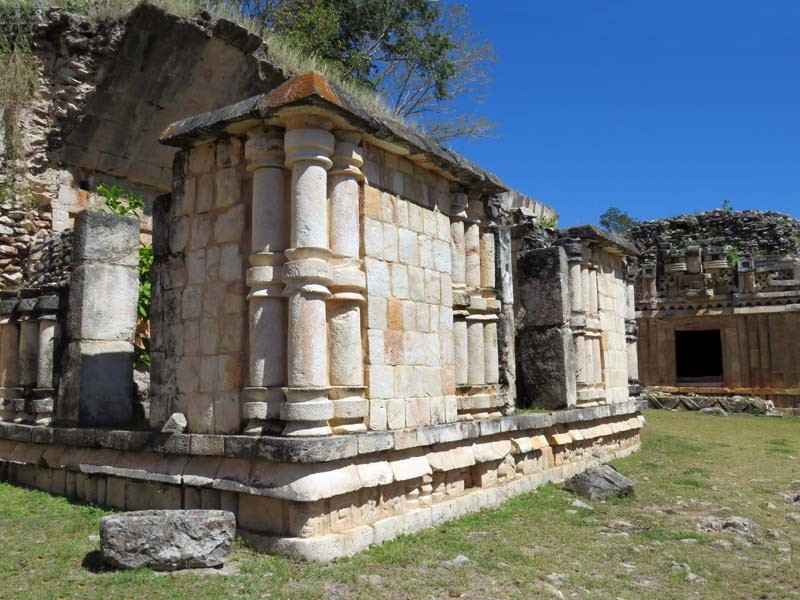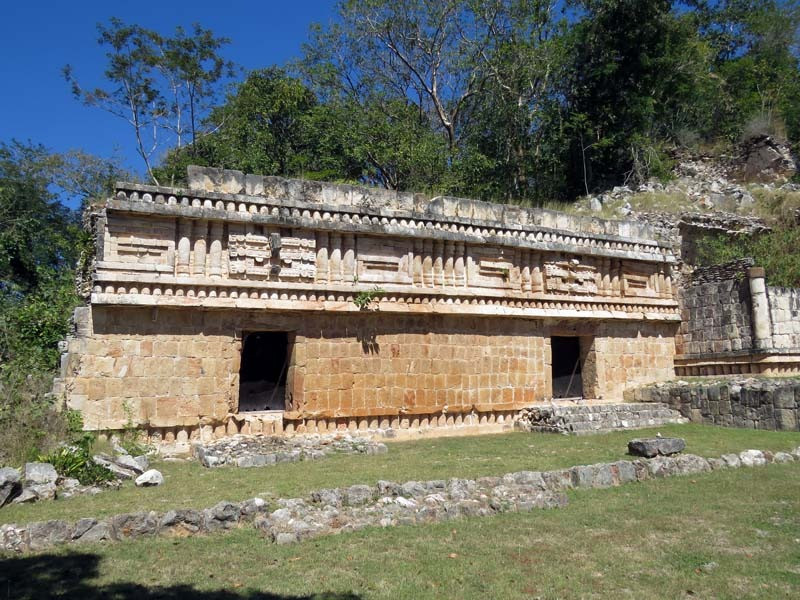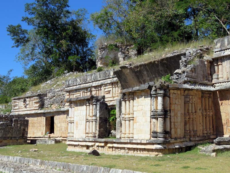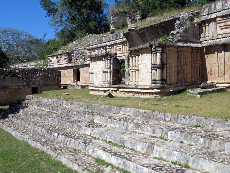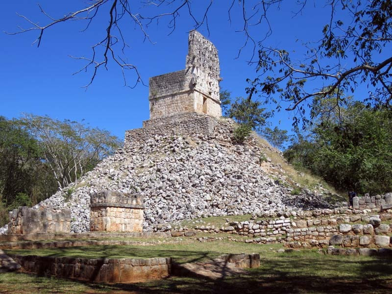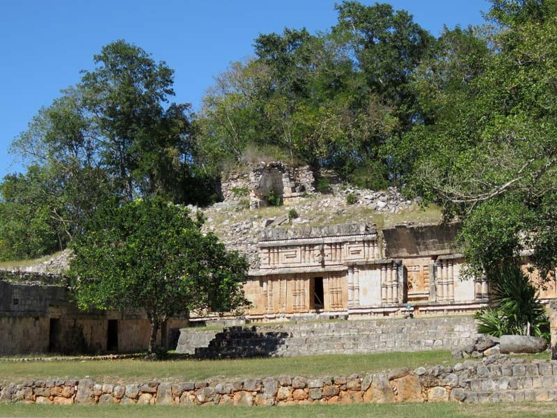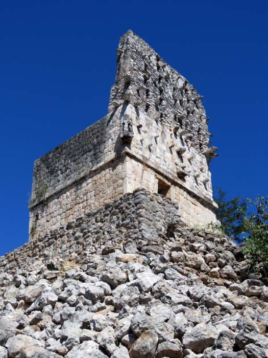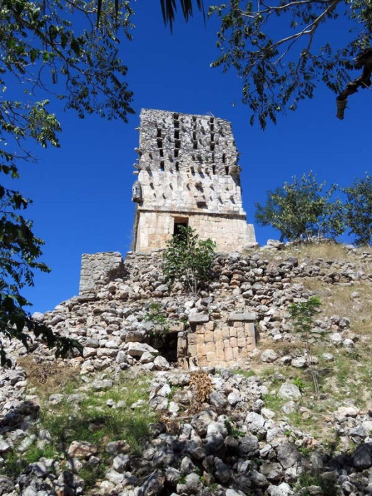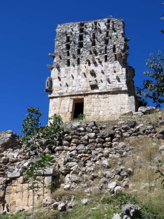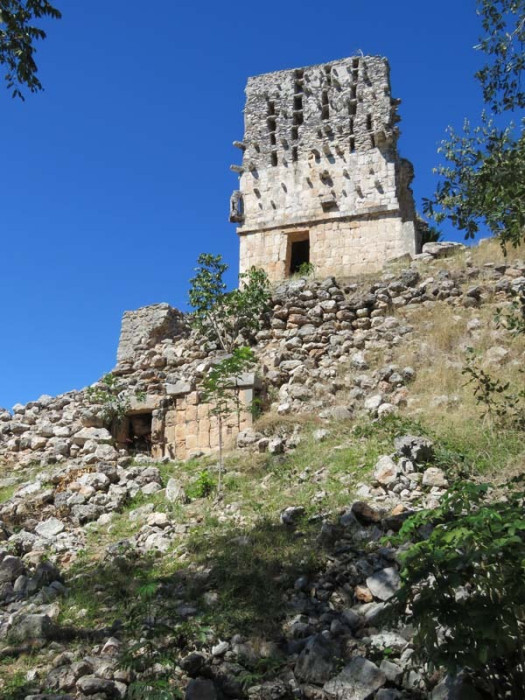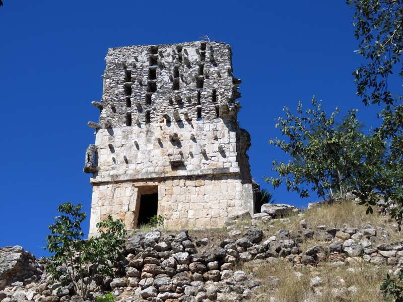 Next to this gateway stands "El Mirador", a pyramid-like structure on top of a mound surmounted by a temple. Only the temple atop the mound has been restored. It is of an Early Puuc Style composed of five vaulted rooms. Also on the site is the Temple of the Columns.