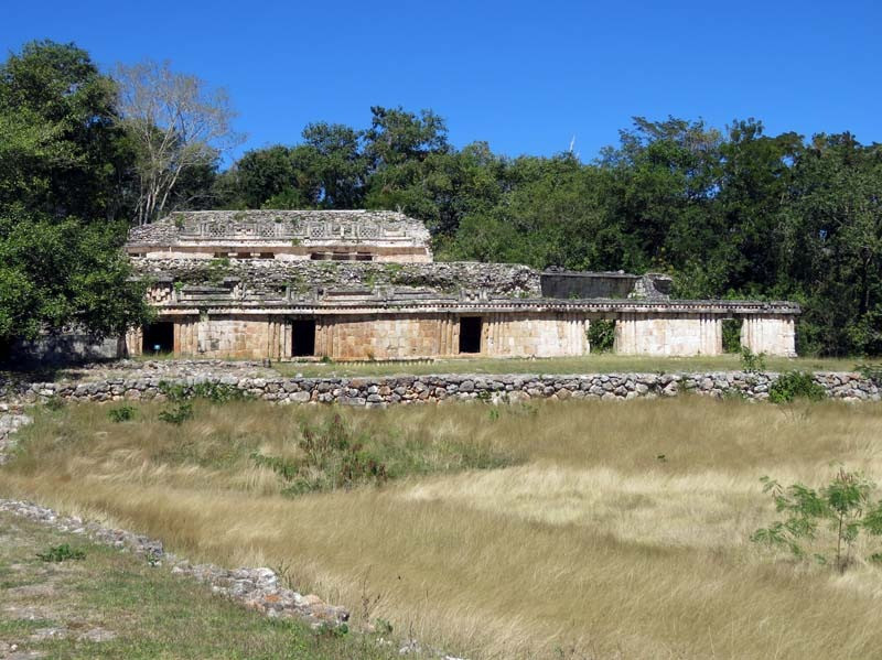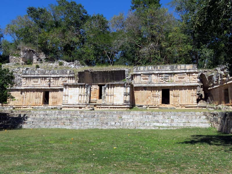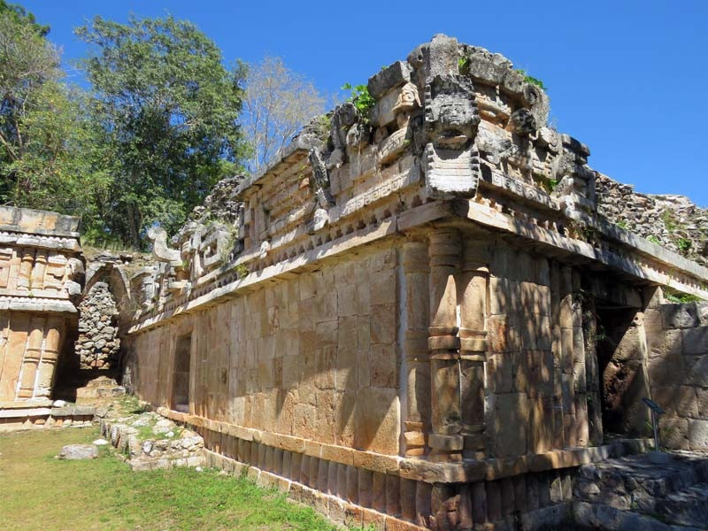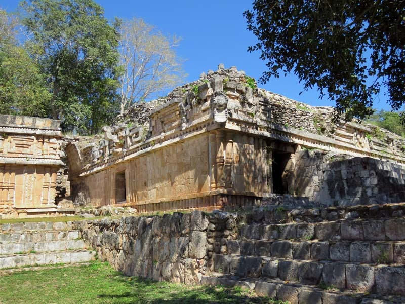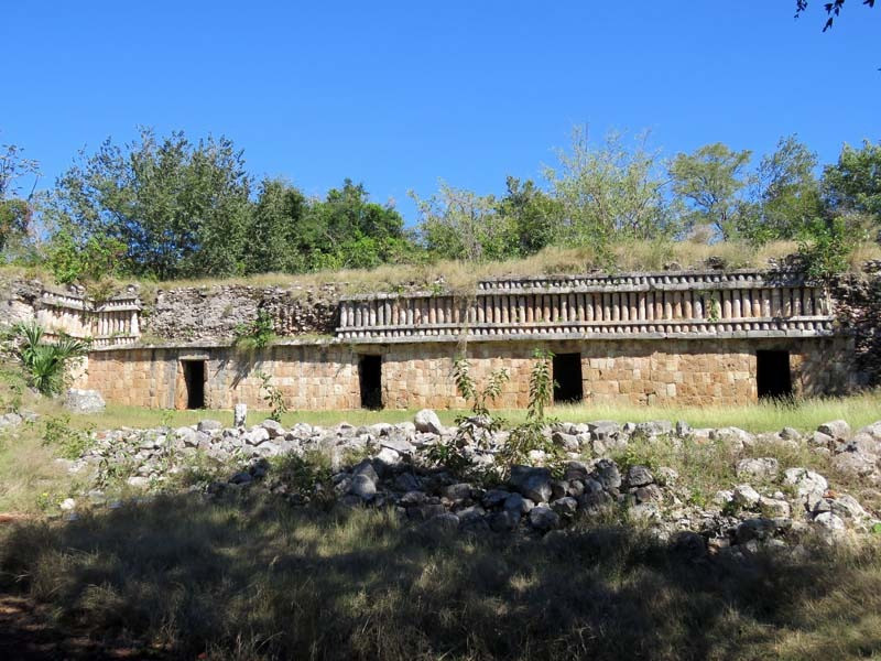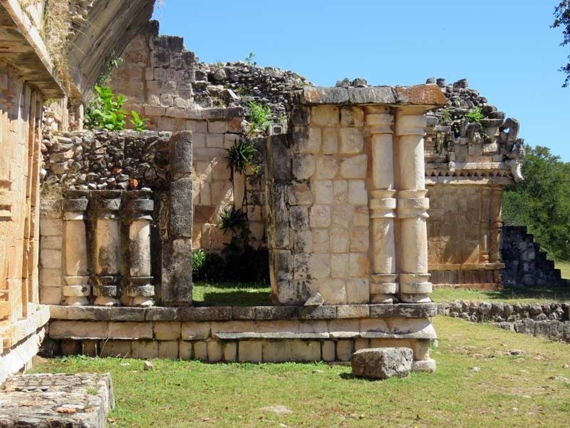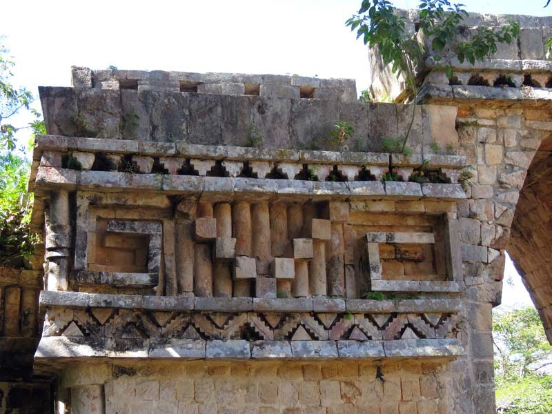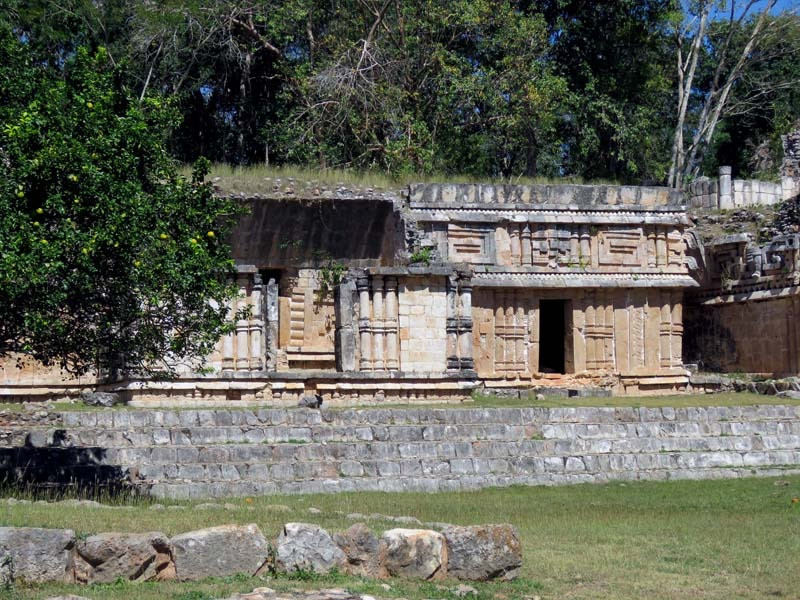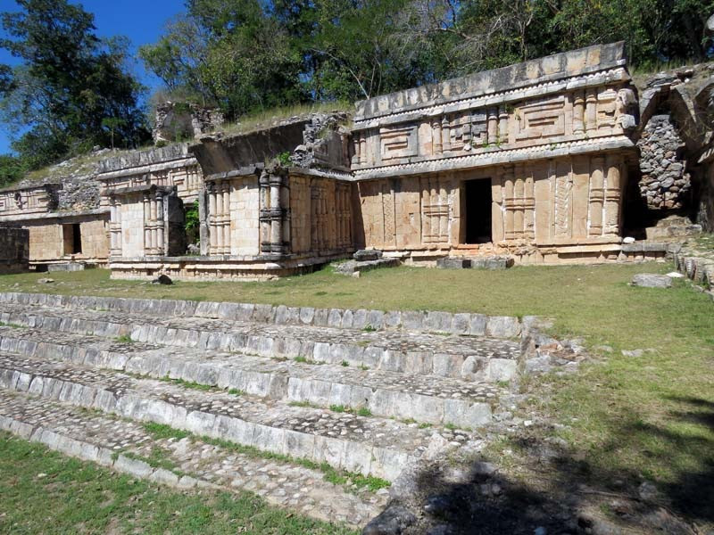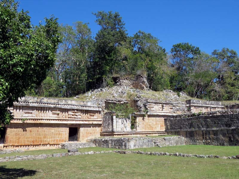 Next to this gateway stands "El Mirador", a pyramid-like structure on top of a mound surmounted by a temple. Only the temple atop the mound has been restored. It is of an Early Puuc Style composed of five vaulted rooms. Also on the site is the Temple of the Columns.