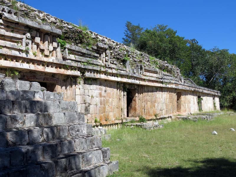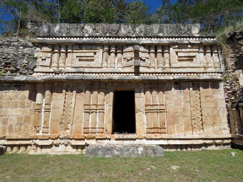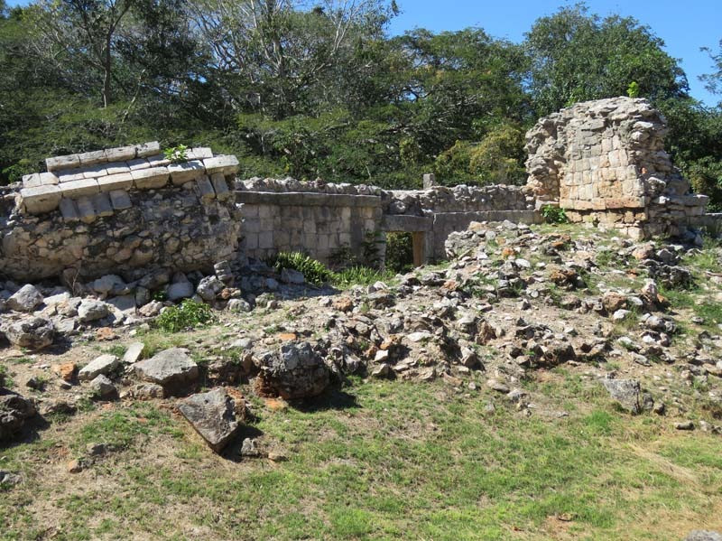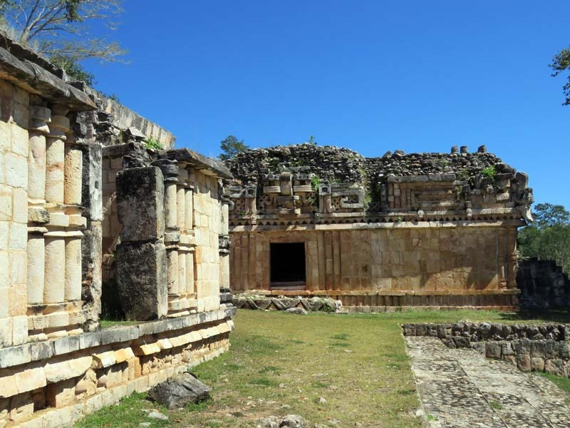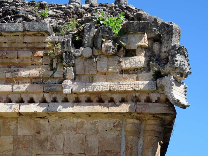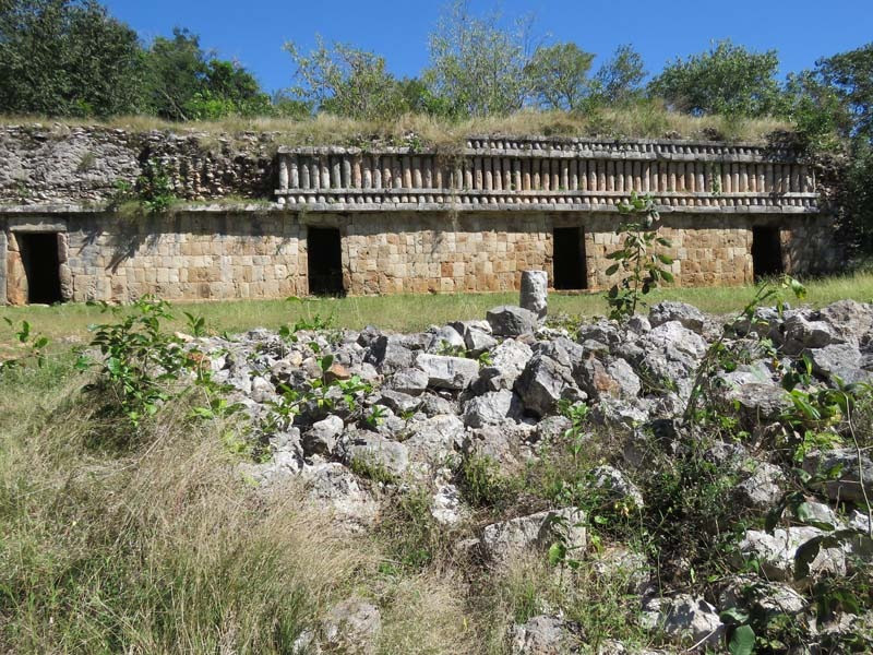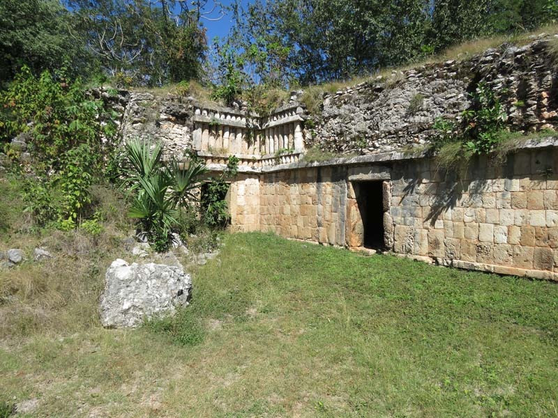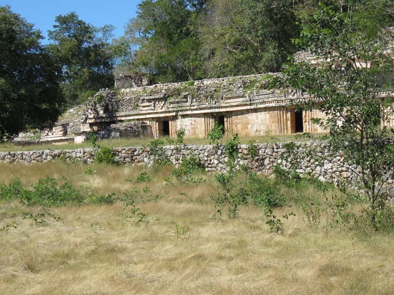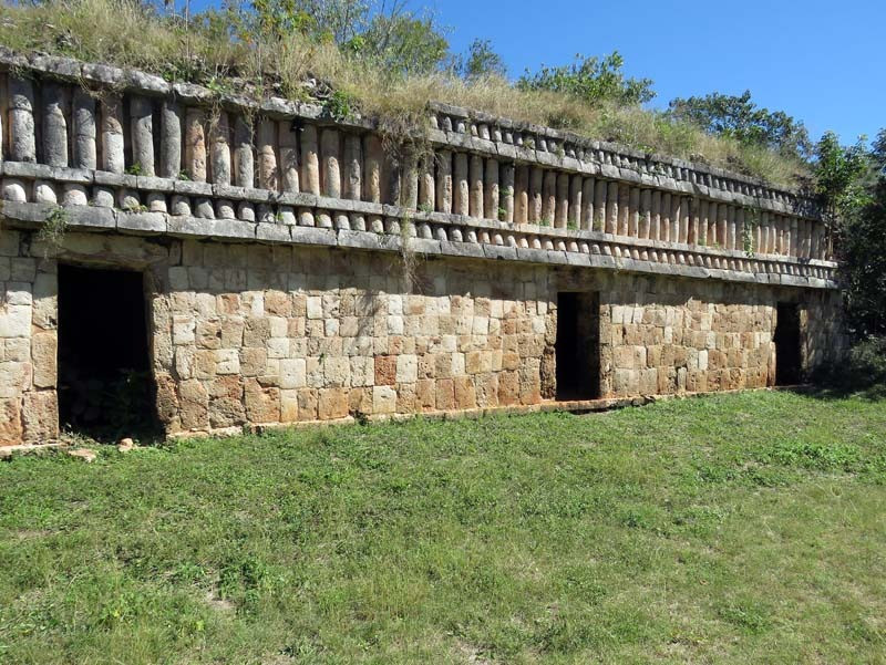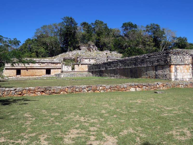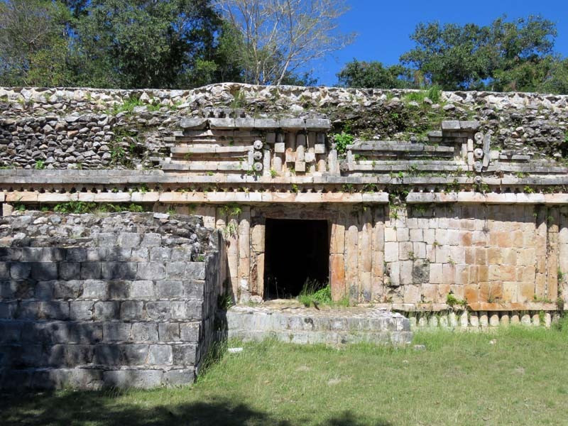 Next to this gateway stands "El Mirador", a pyramid-like structure on top of a mound surmounted by a temple. Only the temple atop the mound has been restored. It is of an Early Puuc Style composed of five vaulted rooms. Also on the site is the Temple of the Columns.