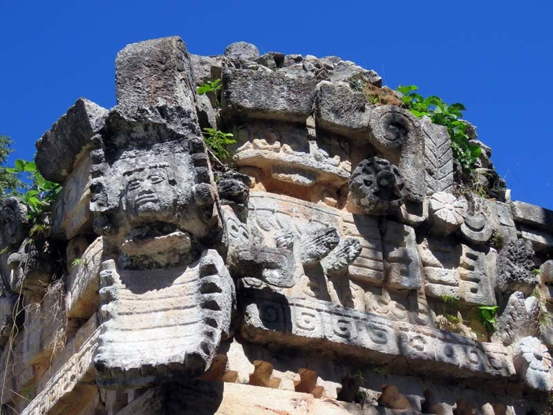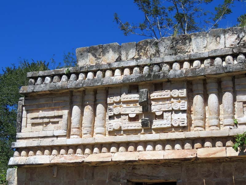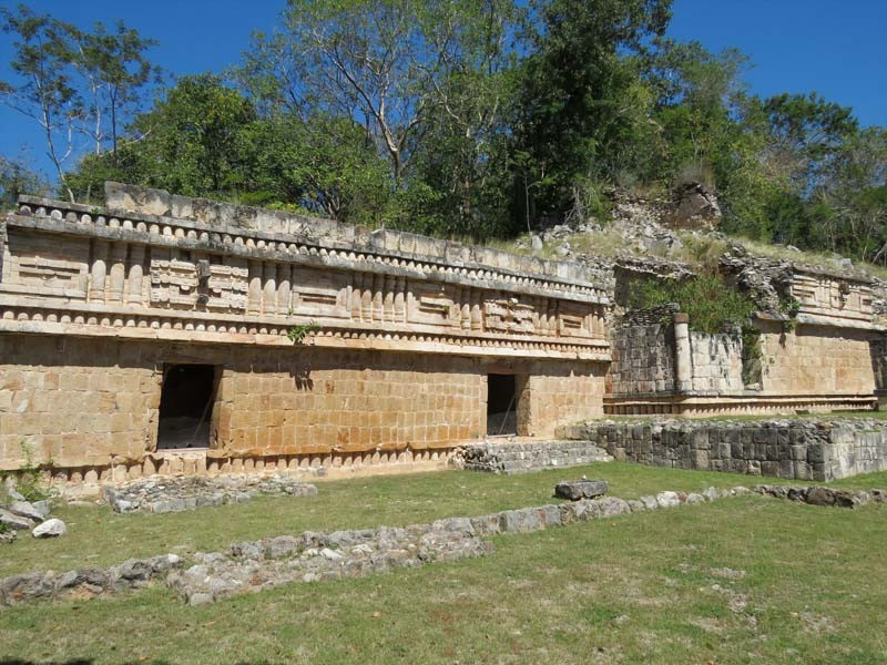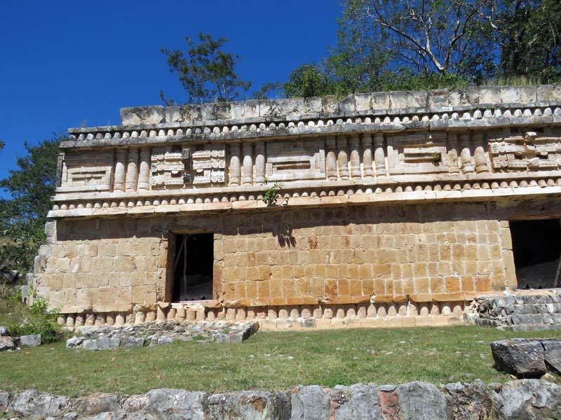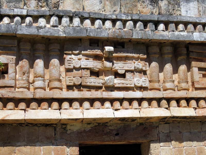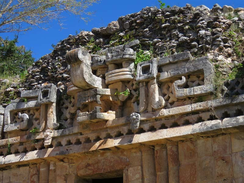 The structural design and motifs of the site's buildings are in the Maya architecture regional style known as Puuc. This makes extensive use of well-cut stone forming patterns and depictions, including masks of the long-nosed rain god Chaac.
