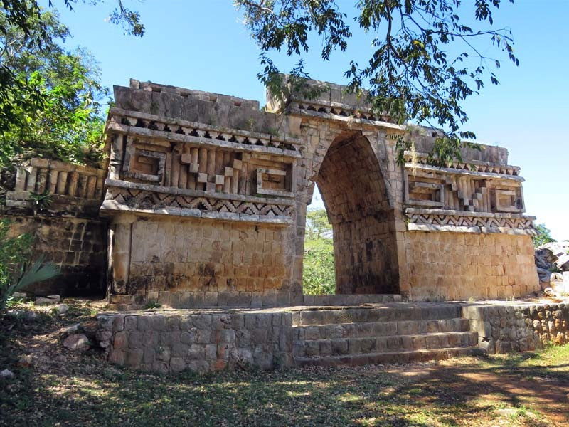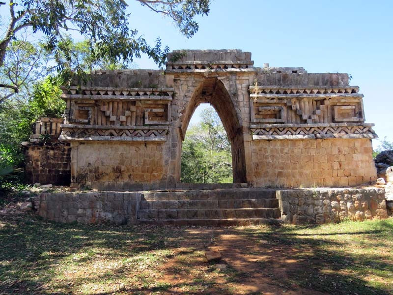 From the palace, a ceremonial road (sacbe) extends to an elaborately decorated gateway arch ("El Arco"). This structure is 3 m (9.8 ft) wide and 6 m high, with well-reserved bas-reliefs. The arch at Labná is famous for being one of the most intricately decorated archs yet discovered in the world of the ancient Maya. Chac masks are seen on both of the arch´s upper corners. Carvings of stylized Mayan huts appear above the doorways. The arch is not an entrance to the city but rather is a passageway between two courtyards. In the west courtyard of the Arch Group is a low restored structure that has some stone mosaic work. Around the small courtyard are other unrestored ruins. There are smaller unrestored ruins throughout the site, with a few in good condition farther out from the core center.