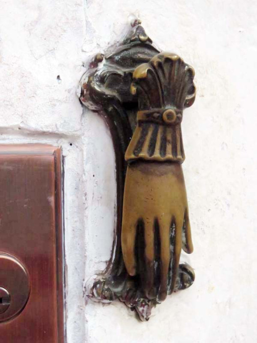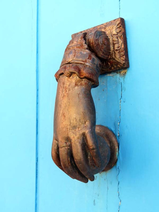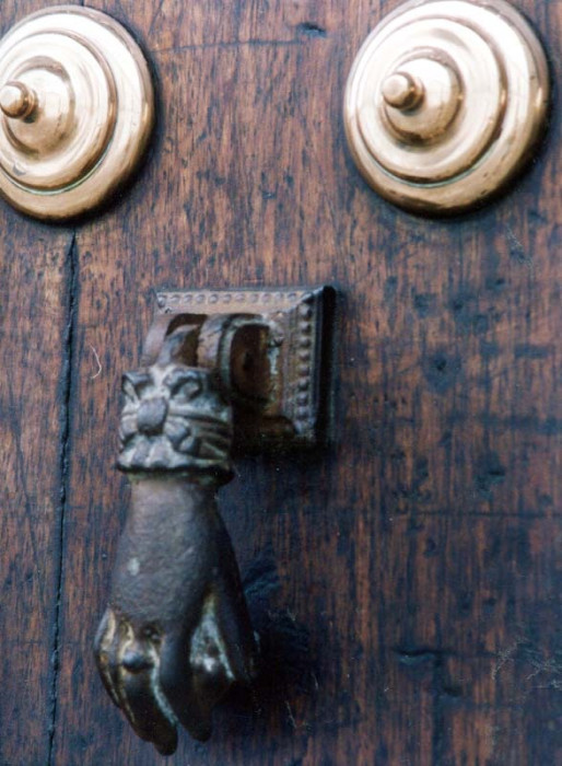 1 Old brass hand door knocker on an old door in Guatemala 800