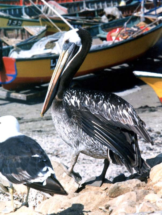 Pelicans are a genus of large water birds that make up the family Pelecanidae. They are characterized by a long beak and a large throat pouch used for catching prey and draining water from the scooped-up contents before swallowing. They have predominantly pale plumage, except for the brown and Peruvian pelicans. The bills, pouches, and bare facial skin of all pelicans become brightly colored before the breeding season. The eight living pelican species have a patchy global distribution, ranging latitudinally from the tropics to the temperate zone, though they are absent from interior South America and from polar regions and the open ocean.