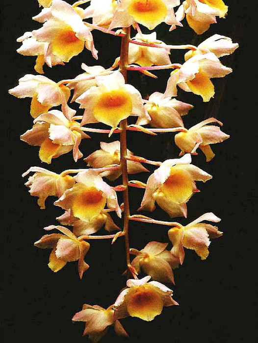 Dendrobium is a genus of mostly epiphytic and lithophytic orchids in the family Orchidaceae. It is a very large genus, containing more than 1,800 species that are found in diverse habitats throughout much of south, east, and southeast Asia, including China, Japan, India, the Philippines, Indonesia, Australia, New Guinea, Vietnam, and many of the islands of the Pacific. Orchids in this genus have roots that creep over the surface of trees or rocks, rarely having their roots in soil. Up to six leaves develop in a tuft at the tip of a shoot and from one to a large number of flowers are arranged along an unbranched flowering stem. Several attempts have been made to separate Dendrobium into smaller genera, but most have not been accepted by the World Checklist of Selected Plant Families.