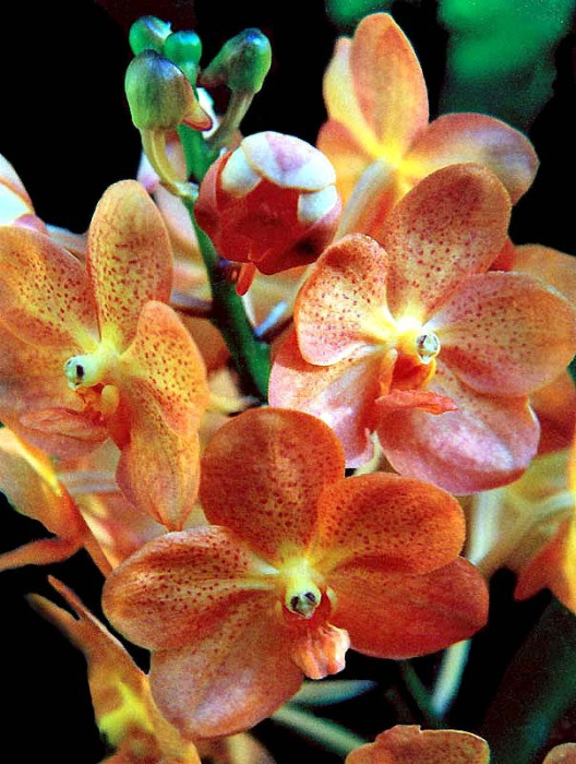 Vanda, abbreviated in the horticultural trade as V., is a genus in the orchid family, Orchidaceae. There are about 80 species, and the genus is commonly cultivated for the marketplace. This genus and its allies are considered to be among the most specifically adapted of all orchids within the Orchidaceae. The genus is highly prized in horticulture for its showy, fragrant, long-lasting, and intensely colorful flowers. Vanda species are widespread across East Asia, Southeast Asia, and New Guinea, with a few species extending into Queensland and some of the islands of the western Pacific.