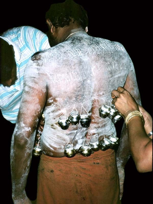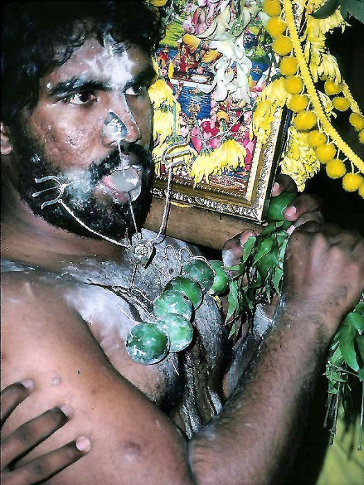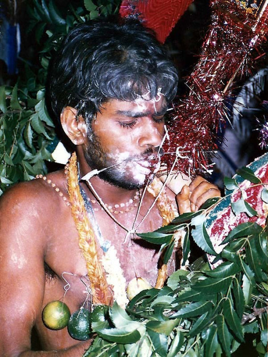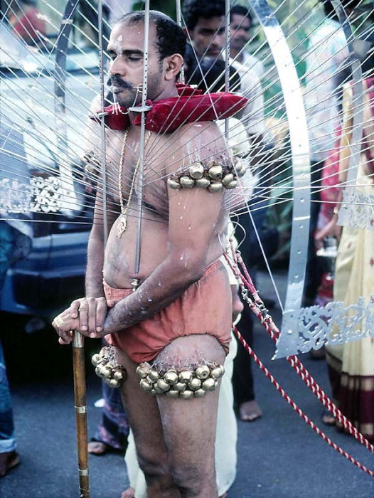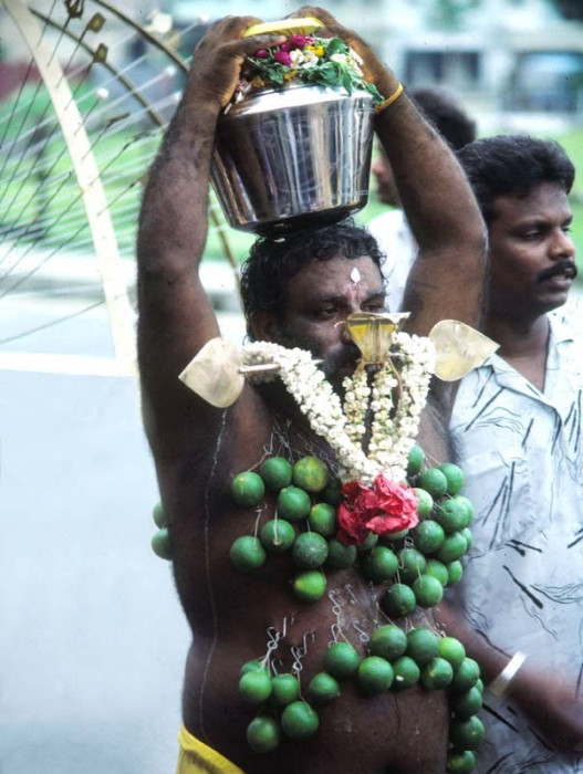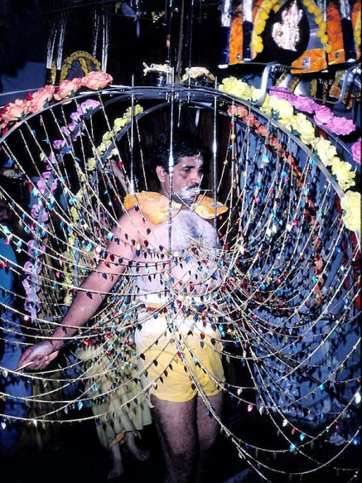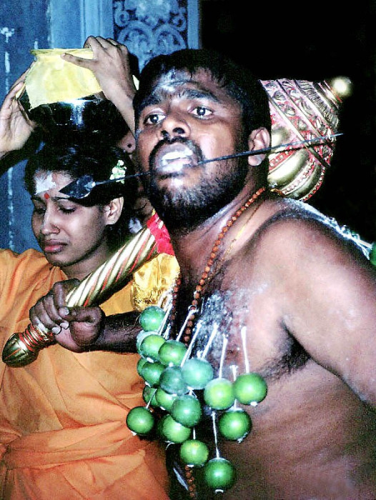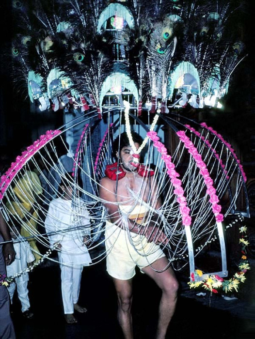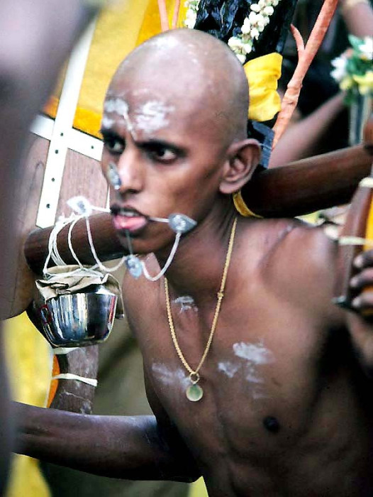 At its simplest, this may entail carrying a pot of milk, but mortification of the flesh by piercing the skin, tongue, or cheeks with vel skewers is also common. The simplest kavadi is a semicircular decorated canopy supported by a wooden rod that is carried on the shoulders to the temple. In addition, some have a small spear through their tongue, or a spear through the cheeks, or large fish-type hooks piercing their body with lemons attached". Some even walk the set route, which may be several miles on top of shoes of nails.