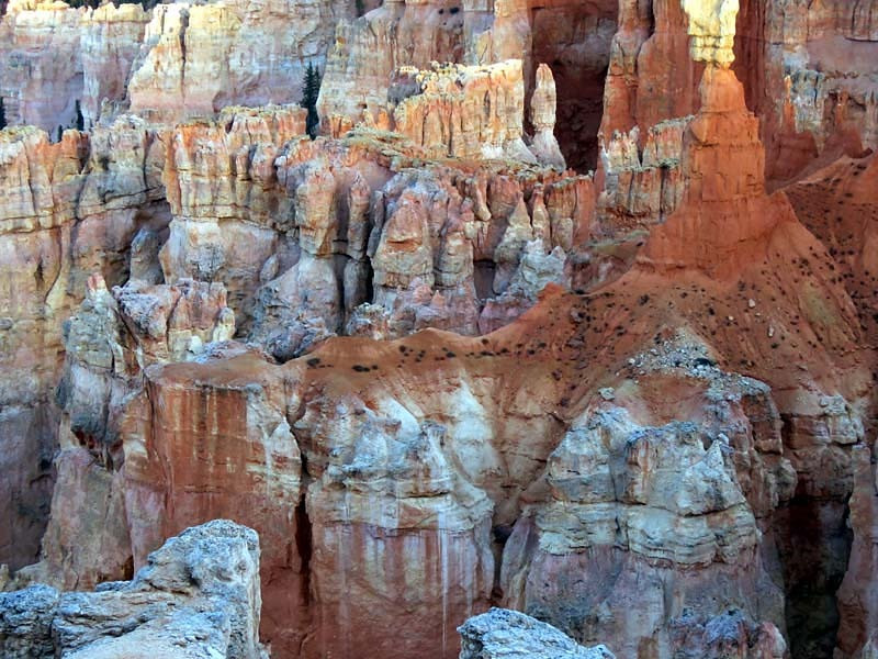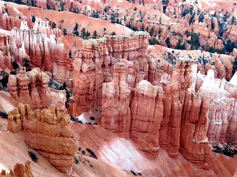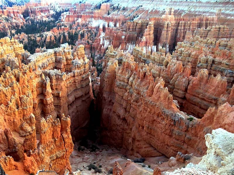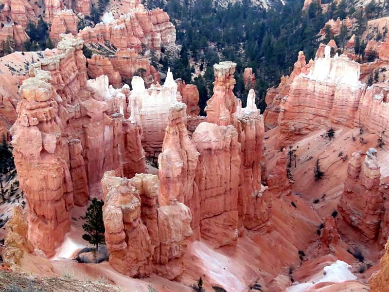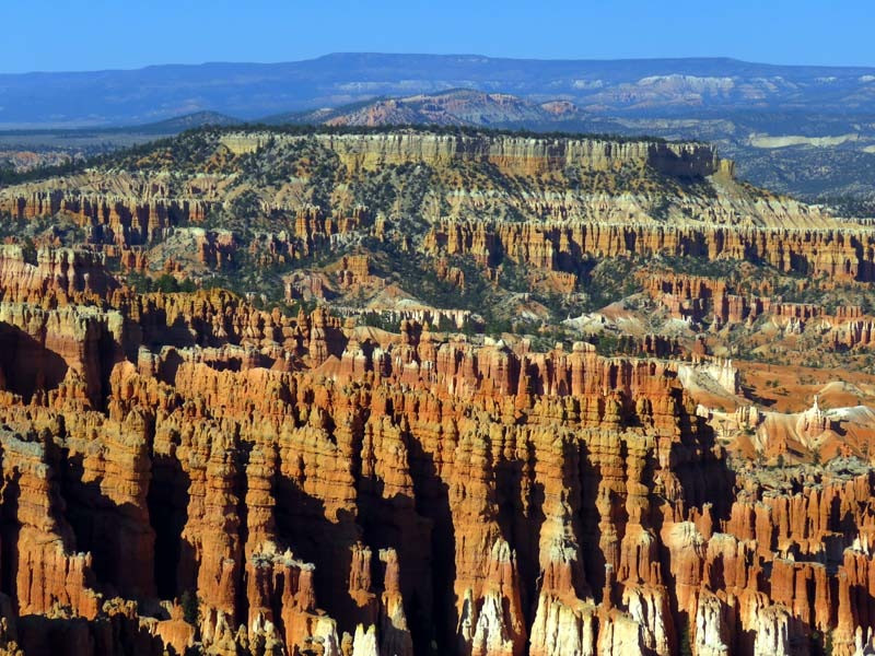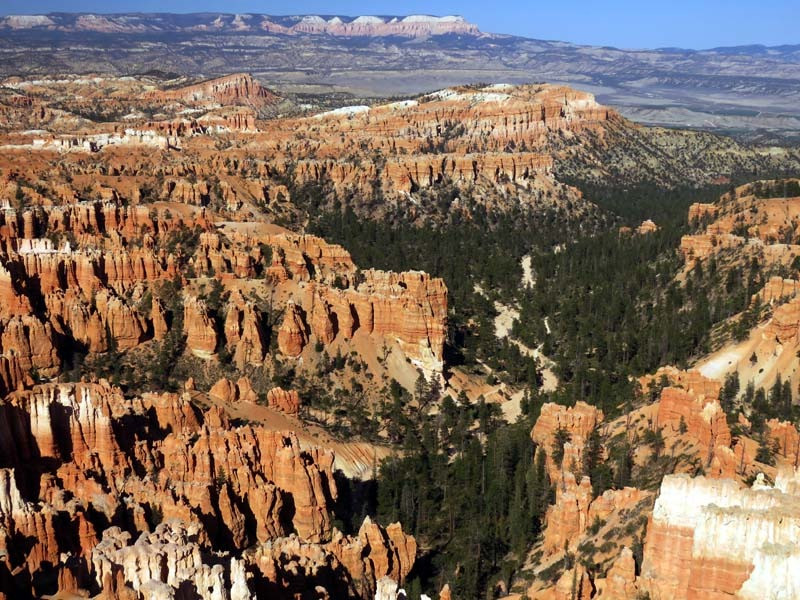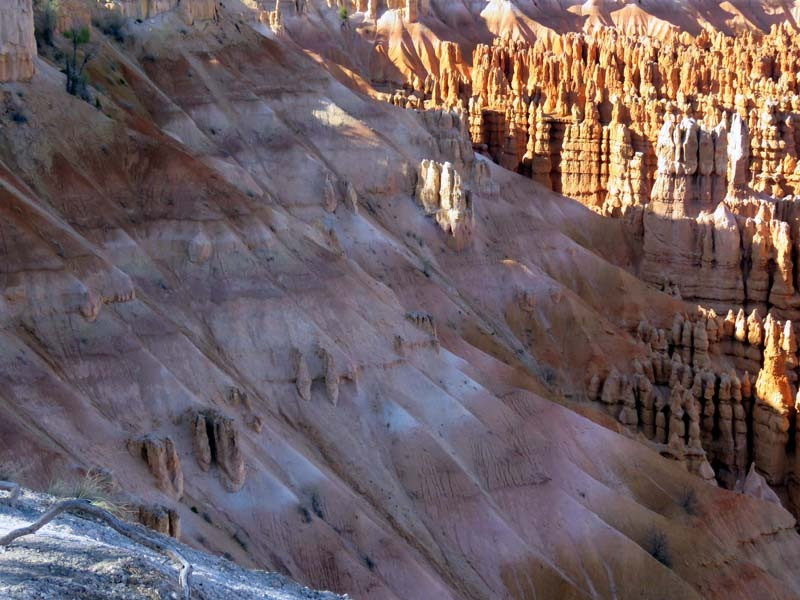 Bryce Canyon National Park is an American national park located in southwestern Utah. The major feature of the park is Bryce Canyon, which despite its name, is not a canyon, but a collection of giant natural amphitheaters along the eastern side of the Paunsaugunt Plateau. Bryce is distinctive due to geological structures called hoodoos, formed by frost weathering and stream erosion of the river and lake bed sedimentary rocks. The red, orange and white colors of the rocks provide spectacular views for park visitors. Bryce Canyon National Park is much smaller and sits at a much higher elevation than nearby Zion National Park. The rim at Bryce varies from 8,000 to 9,000 feet.