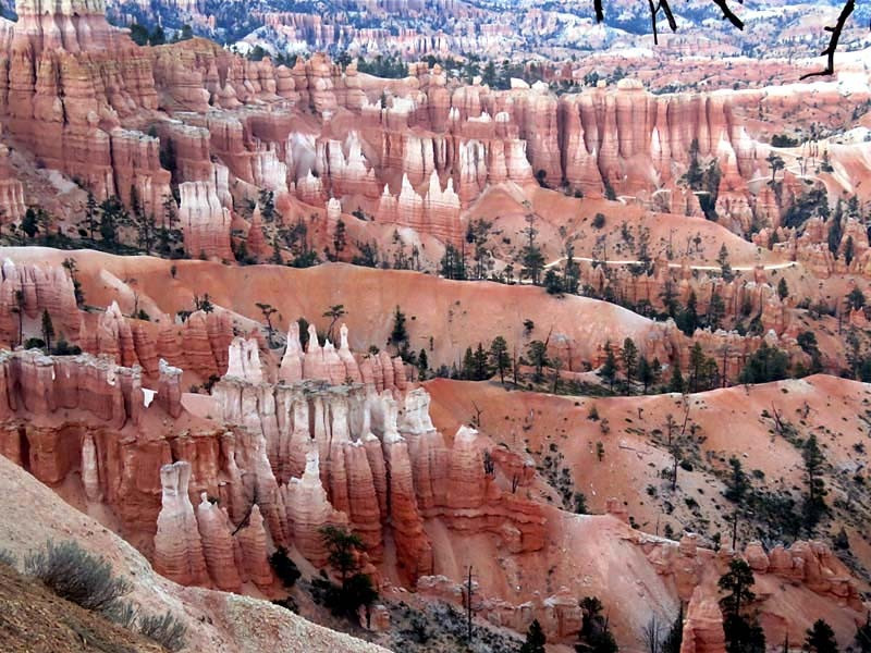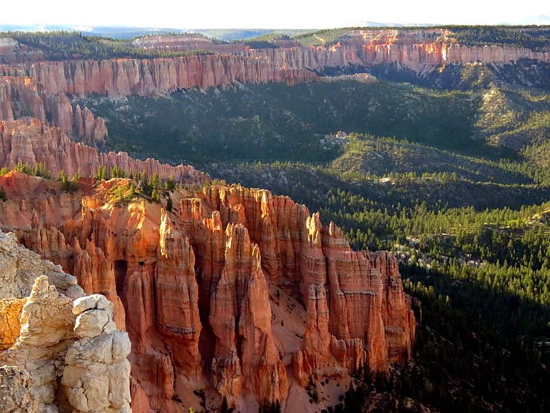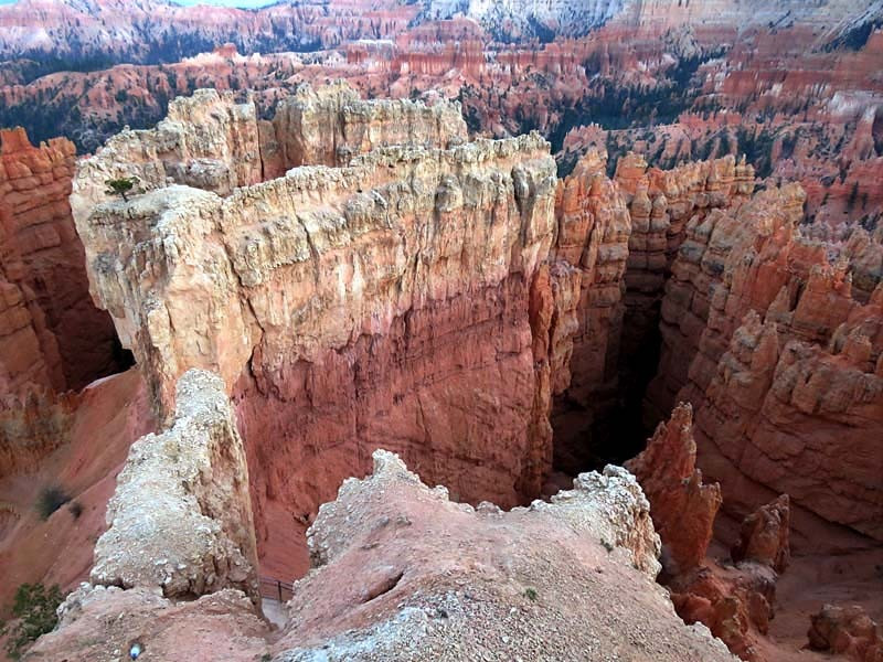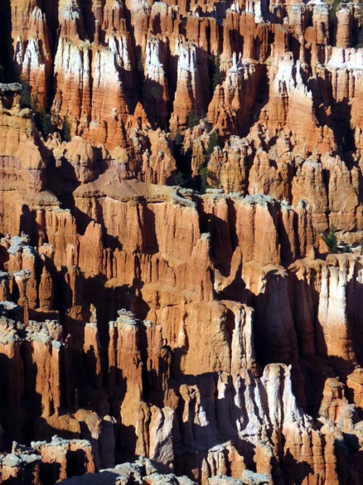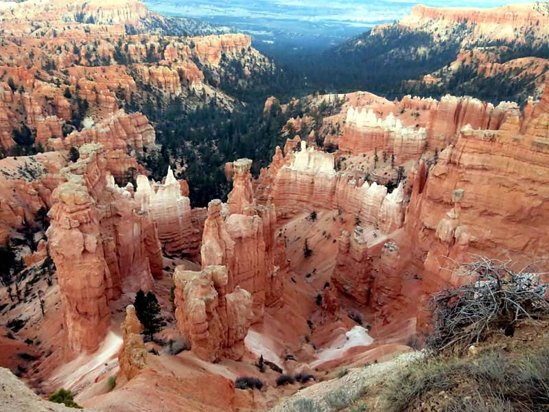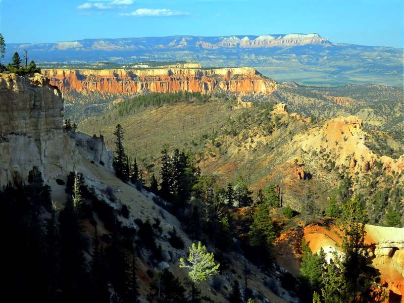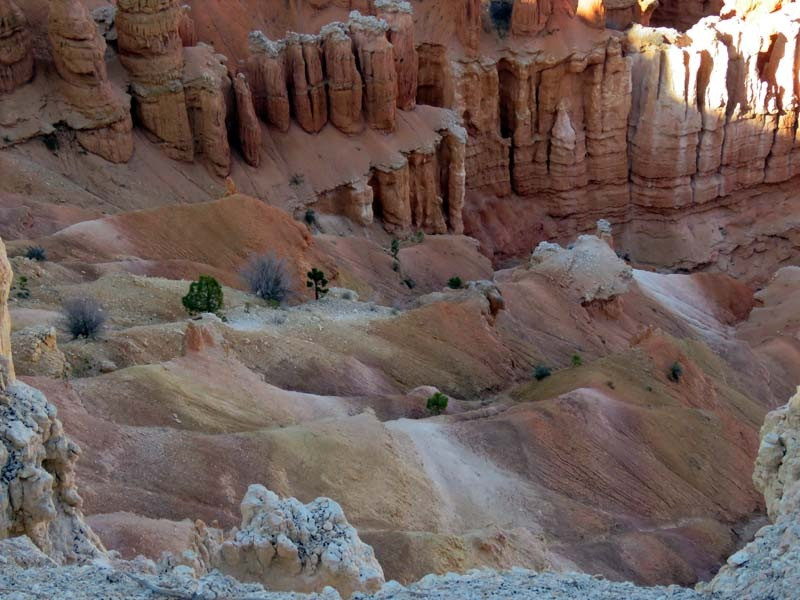 Bryce Canyon National Park is an American national park located in southwestern Utah. The major feature of the park is Bryce Canyon, which despite its name, is not a canyon, but a collection of giant natural amphitheaters along the eastern side of the Paunsaugunt Plateau. Bryce is distinctive due to geological structures called hoodoos, formed by frost weathering and stream erosion of the river and lake bed sedimentary rocks. The red, orange and white colors of the rocks provide spectacular views for park visitors. Bryce Canyon National Park is much smaller and sits at a much higher elevation than nearby Zion National Park. The rim at Bryce varies from 8,000 to 9,000 feet.