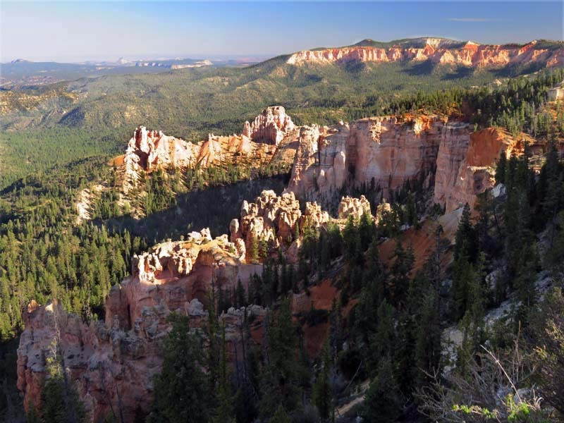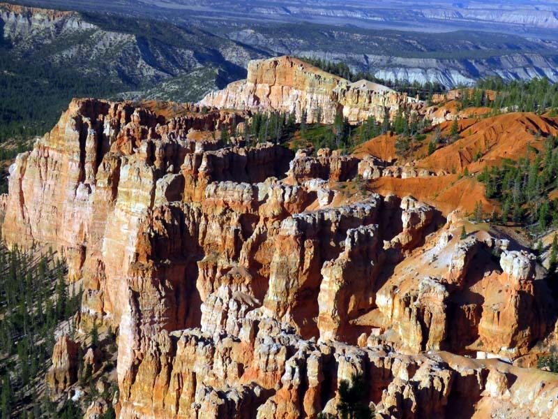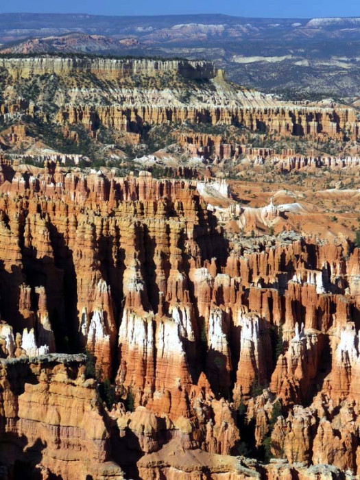 Bryce Canyon was not formed from erosion initiated by a central stream, meaning it technically is not a canyon. Instead, headward erosion has excavated large amphitheater-shaped features in the Cenozoic-aged rocks of the Paunsaugunt Plateau. This erosion resulted in delicate and colorful pinnacles called hoodoos that are up to 200 feet high. A series of amphitheaters extends more than 20 miles north-to-south within the park. The largest is Bryce Amphitheater, which is 12 miles long, 3 miles wide, and 800 feet deep. A nearby example of amphitheaters with hoodoos in the same formation but at a higher elevation is in Cedar Breaks National Monument, which is 25 miles to the west on the Markagunt Plateau.