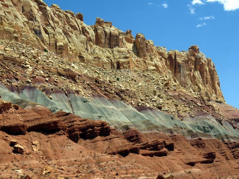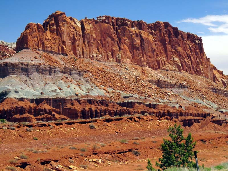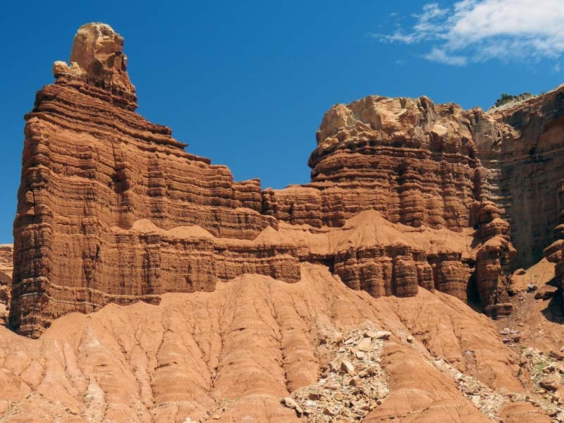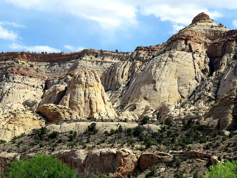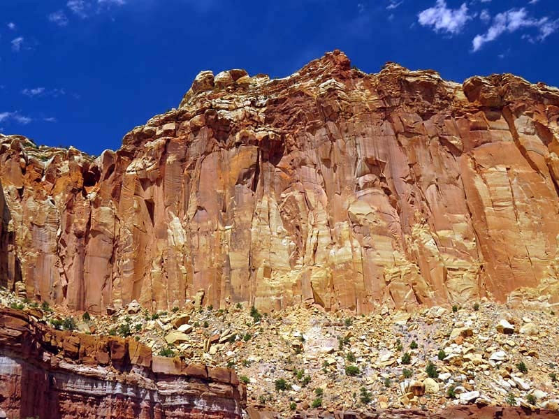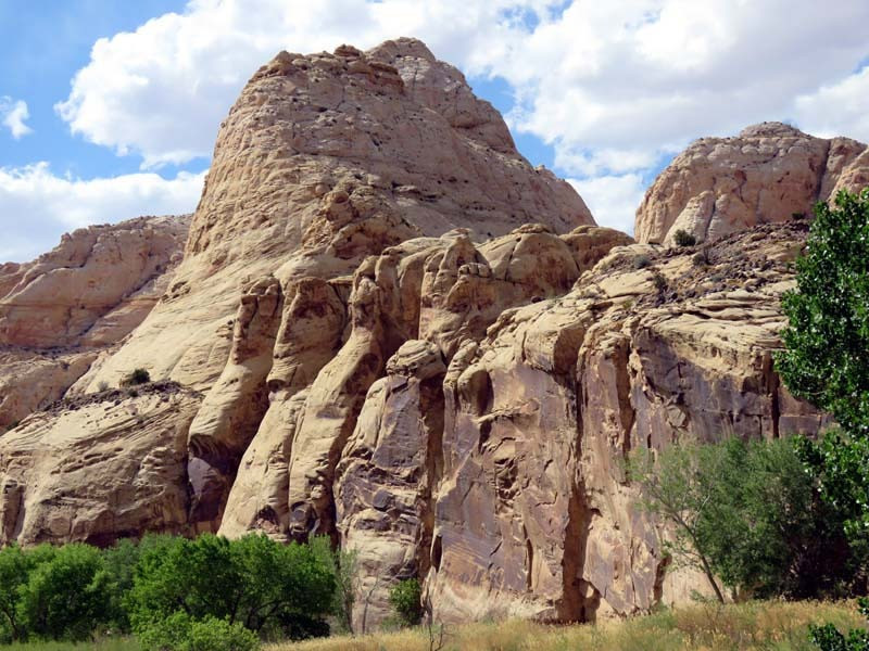 The majority of the nearly 100 mi long up-thrust formation called the Waterpocket Fold—a rocky spine extending from Thousand Lake Mountain to Lake Powell—is preserved within the park. Capitol Reef is an especially rugged and spectacular segment of the Waterpocket Fold by the Fremont River. The park was named for its whitish Navajo Sandstone cliffs with dome formations—similar to the white domes often placed on capitol buildings—that run from the Fremont River to Pleasant Creek on the Waterpocket Fold. Locally, reef refers to any rocky barrier to land travel, just as ocean reefs are barriers to sea travel.