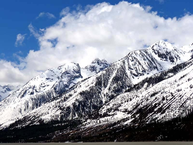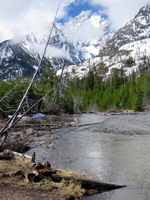 Grand Teton National Park is named for Grand Teton, the tallest mountain in the Teton Range. The naming of the mountains is attributed to early 19th-century French-speaking trappers—les trois tétons (the three teats) was later anglicized and shortened to Tetons. At 13,775 feet, Grand Teton abruptly rises more than 7,000 feet above Jackson Hole, almost 850 feet higher than Mount Owen, the second-highest summit in the range. The park has numerous lakes, including 15-mile-long Jackson Lake as well as streams of varying lengths and the upper main stem of the Snake River. Though in a state of recession, a dozen small glaciers persist at the higher elevations near the highest peaks in the range. Some of the rocks in the park are the oldest found in any American national park and have been dated for nearly 2.7 billion years.