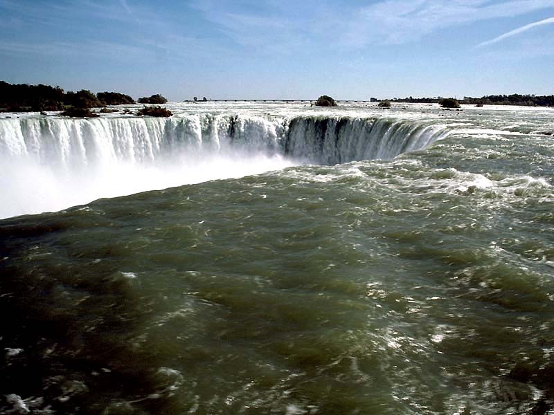 Formed by the Niagara River, which drains Lake Erie into Lake Ontario, the combined falls have the highest flow rate of any waterfall in North America that has a vertical drop of more than 50 m (160 ft). During peak daytime tourist hours, more than six million cubic feet of water goes over the crest of the falls every minute. Horseshoe Falls is the most powerful waterfall in North America, as measured by flow rate. Niagara Falls is famed for its beauty and is a valuable source of hydroelectric power. Balancing recreational, commercial, and industrial uses has been a challenge for the stewards of the falls since the 19th century.