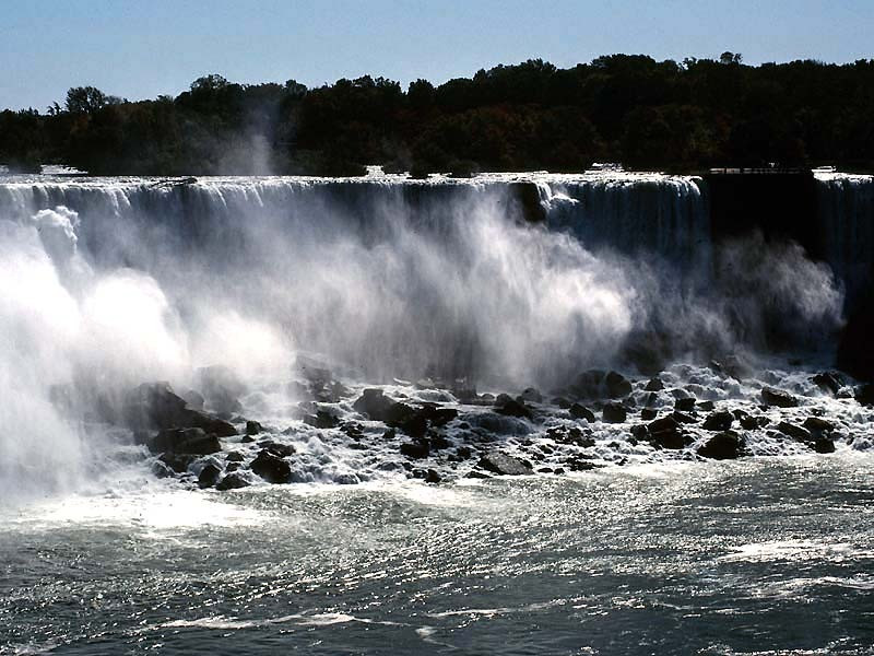 Niagara Falls is a group of three waterfalls at the southern end of Niagara Gorge, spanning the border between the province of Ontario in Canada and the state of New York in the United States. The largest of the three is Horseshoe Falls, also known as Canadian Falls, which straddles the international border of the two countries. The smaller American Falls and Bridal Veil Falls lie within the United States. Bridal Veil Falls is separated from Horseshoe Falls by Goat Island and from American Falls by Luna Island, with both islands situated in New York.